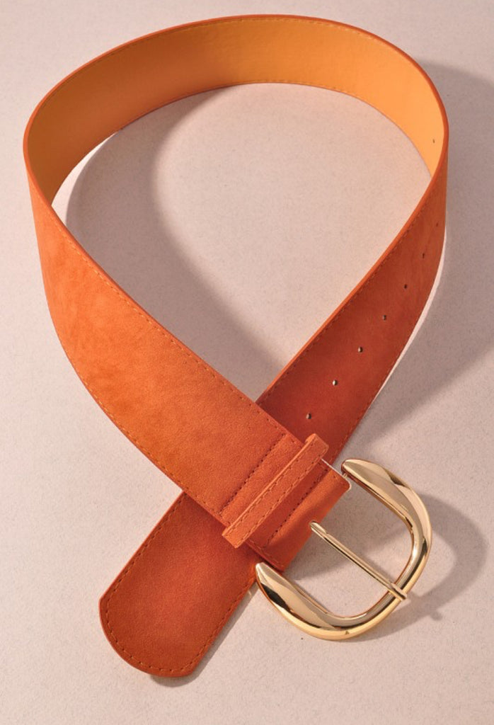 This suede belt features a smooth suede finish and a sleek rounded gold buckle. Its versatile, sophisticated design pairs perfectly with jeans, skirts, or dresses, adding texture and polish to any outfit. A timeless accessory that complements both casual and chic looks.