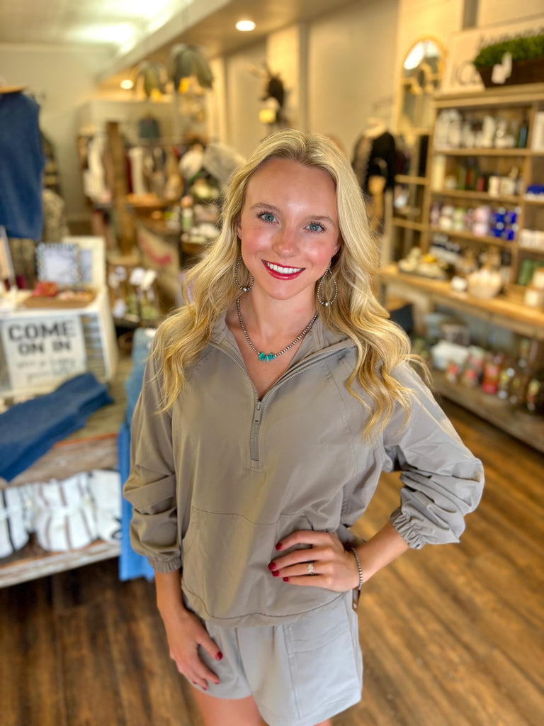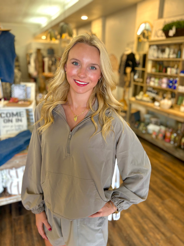 Lightweight active jacket with quarter zip and cinched waistband in the color stone taupe. Pairs well with the adventure shorts.