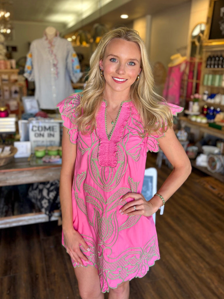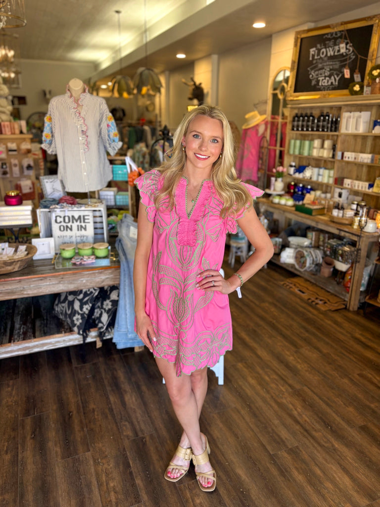 This one is a total statement piece. The vibrant pink paired with intricate embroidery gives this dress the prettiest, eye-catching detail that feels both bold and feminine. The flutter sleeves and scalloped trim add a soft, romantic touch, while the relaxed fit keeps it comfortable and easy to wear all day long.