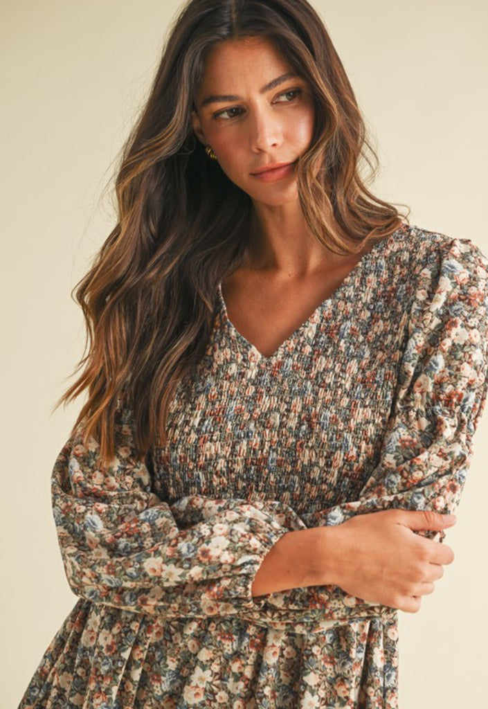 This darling mini dress is the perfect blend of sweet + stylish. Featuring a vintage ditsy floral print and smocking along the front and back, it gives you that flattering, comfortable fit everyone loves. The babydoll silhouette adds a soft, flowy shape, while the long puff sleeves bring the cutest touch of charm. Finished with a V-neckline and hidden side pockets (yes, pockets!), this dress is an easy favorite for everyday wear or special outings.
