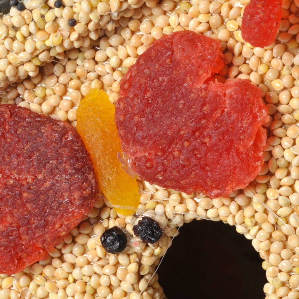 Ingredients: millet, black oil sunflower, flax, canola, apricot, strawberry, kiwi, blueberry gelatin.