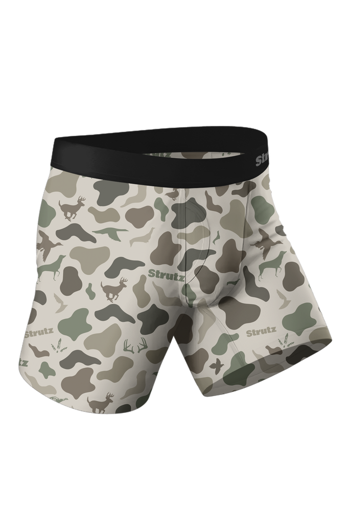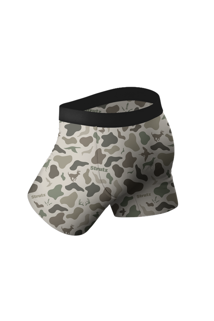 Take on the outdoors in style and comfort with our Strutz Camo Bottoms. With a super soft material, these men's boxer briefs are perfect for any adventure. Embrace the outdoors with a touch of comfort and style.