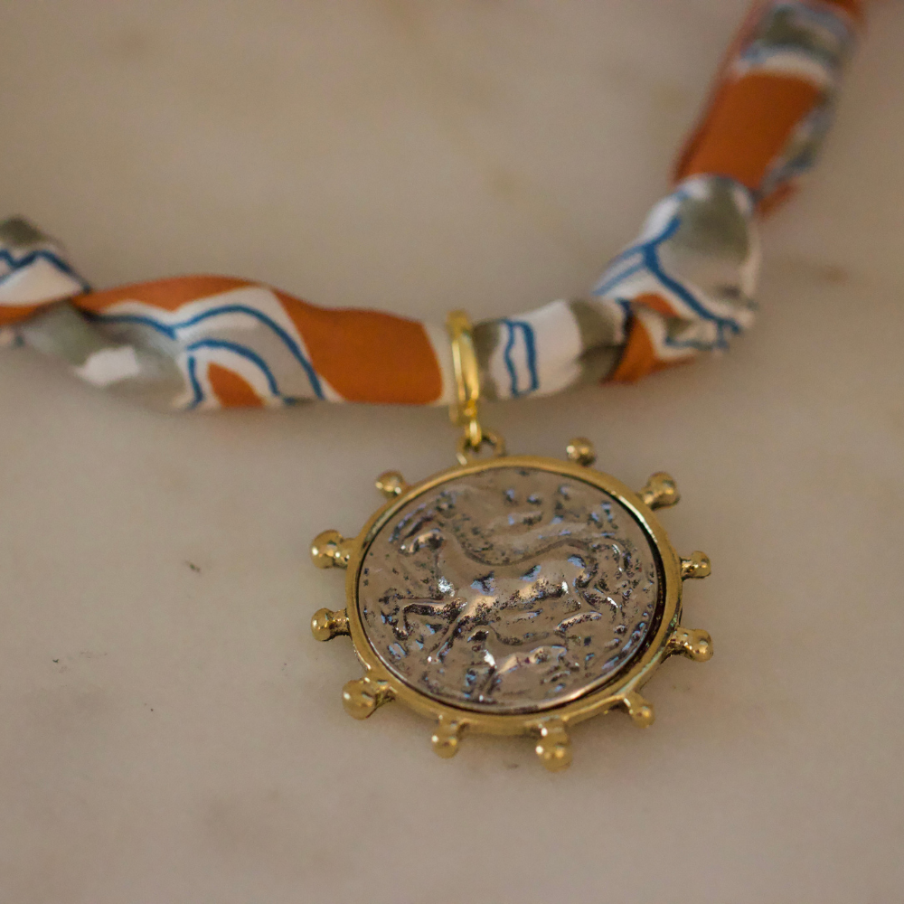 Celebrate bold style and graceful strength with the Terra Mare Scarf Necklace. This eye-catching piece features an orange patterned scarf adorned with galloping horses — a design that captures the beauty of freedom and movement. At its center, a two-tone coin pendant framed in gold adds a touch of vintage charm and refinement. Wear it as a necklace, tie it around your wrist, or loop it onto your favorite handbag — this versatile design brings a warm, spirited energy to any look. Key Features: * Orange scarf patterned with galloping horses * Two-tone coin pendant with gold detailing * Lightweight, adjustable, and comfortable to wear * Versatile for multiple styling options Materials: Gold-plated pendant with fabric scarf Ideal For: Fall collections, equestrian-inspired jewelry, and boutique accessories