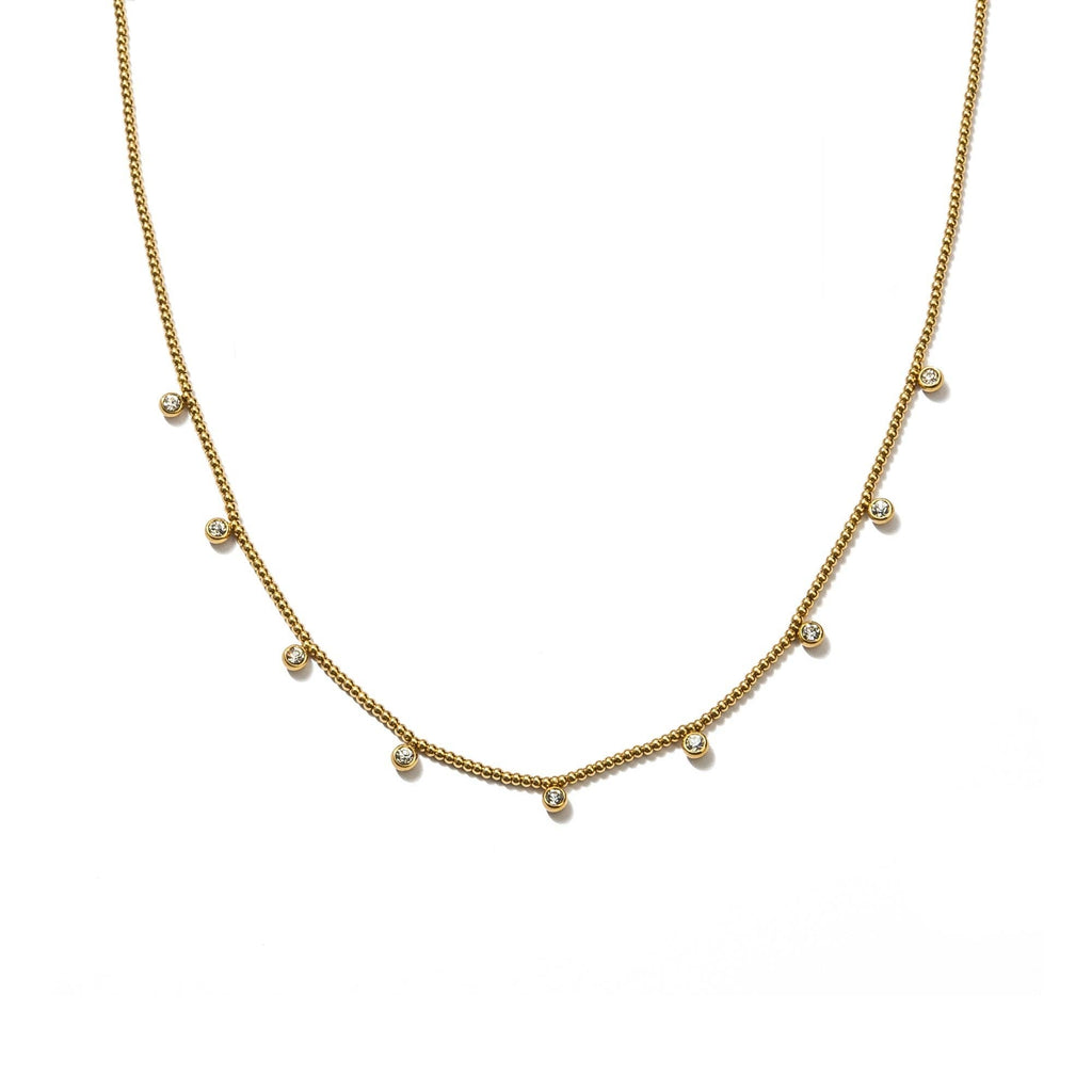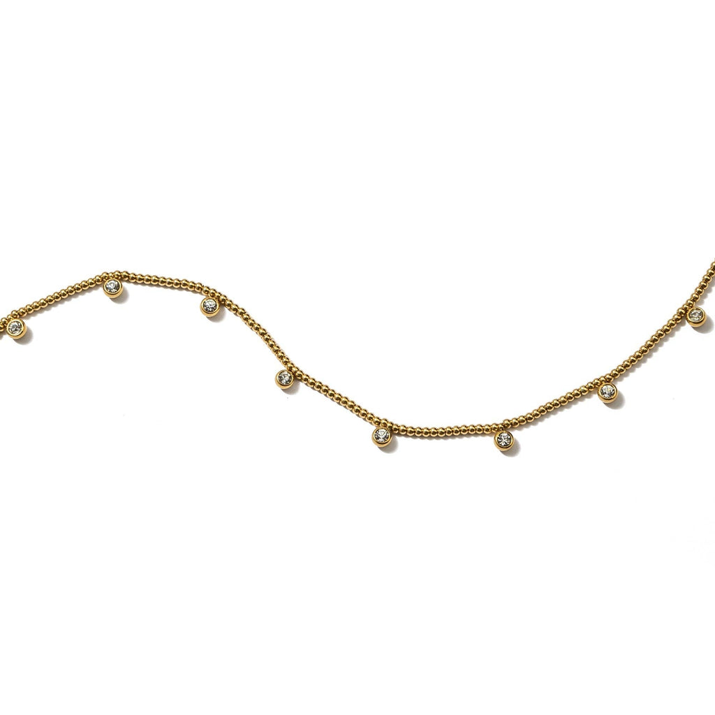 PRODUCT DETAIL * Waterproof💧💧💧 * Stainless Steel * 18K Gold and Cubic Zirconia Crystals * Handmade * Hypoallergenic * Nickel Free * Size: Length 14" + 3" Extender * Closure: Lobster Clasp DESIGNER NOTE Our Beaded Crystal Necklace is crafted with precision and features dazzling crystals intricately set on a dainty chain, creating a mesmerizing display of brilliance. Illuminate your look with the enchanting allure of the necklace and let your inner sparkle shine.