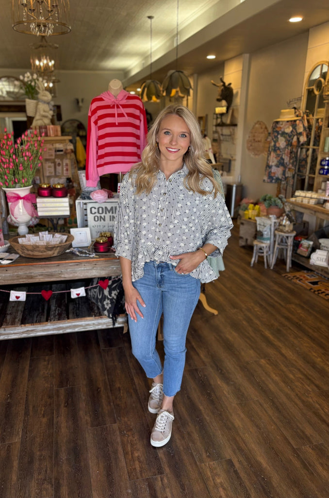 charming button-up top features a soft grid check pattern accented with delicate floral embroidery for a timeless, feminine look. designed with a relaxed fit, quarter-length sleeves, and a playful ruffled hem, it’s effortless yet elevated. lightweight and breathable, this woven top is perfect for everyday wear and transitions beautifully from season to season. style it tucked, half-tucked, or loose for an easy, laid-back feel.
