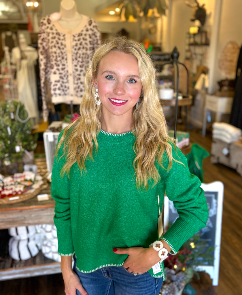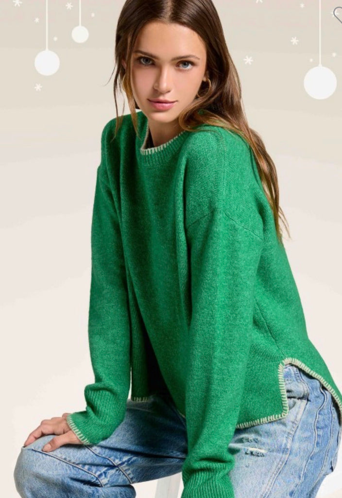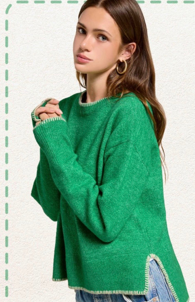 Contrast blanket stitch, soft and stretchy sweater side slits and relaxed fit