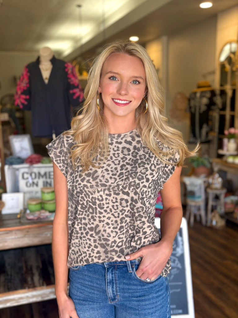 must-have neutral with a fun twist, this leopard print cap sleeve top is the perfect piece for easy everyday styling. Featuring a classic round neckline and soft lightweight knit fabric, it offers a comfortable fit with a polished look. The neutral leopard print makes it easy to pair with denim, shorts, or skirts for a casual-chic outfit you can wear all season long.