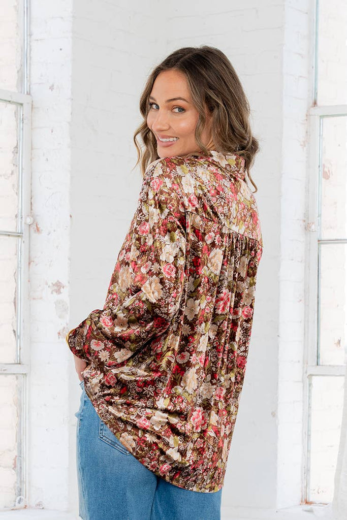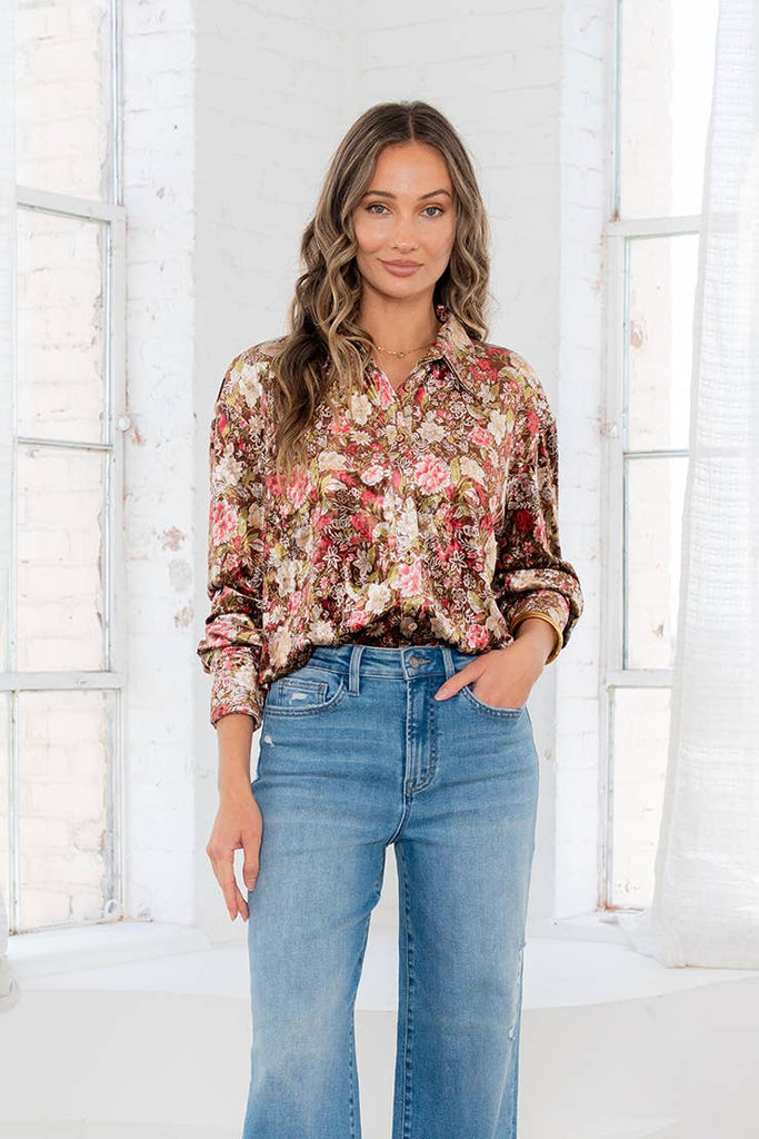 This eye-catching top features a lustrous satin finish with an intricate allover floral print. Designed with a relaxed fit and classic button-down silhouette, it offers a chic take on everyday elegance. Long sleeves with buttoned cuffs and a gently curved hem add refined structure to this standout piece.