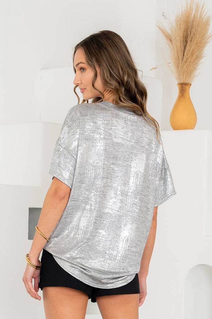 This eye-catching top features an abstract foil-like print with a shimmery finish that adds a bold, statement-making edge. Designed with a relaxed, boxy silhouette and dropped shoulders, it offers both comfort and modern flair. Perfect for elevating any casual or night-out look, it pairs effortlessly with sleek bottoms or layered ensembles.