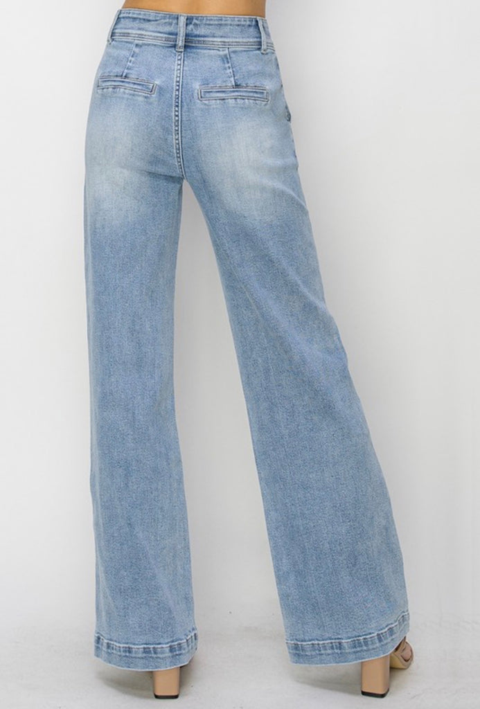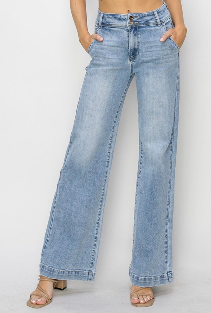 These High Rise Double Button Wide Jeans are a flattering, effortless staple you’ll reach for again and again. Designed with a true high-rise waist, they cinch you in just right while the double button closure adds a subtle, elevated detail. The relaxed wide-leg silhouette creates a long, lean look that’s perfect for dressing up or keeping casual.