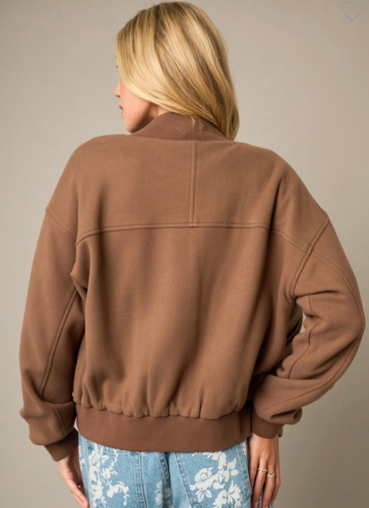 Mocha colored soft fabric, relaxed fit with pockets. Snap button closure.