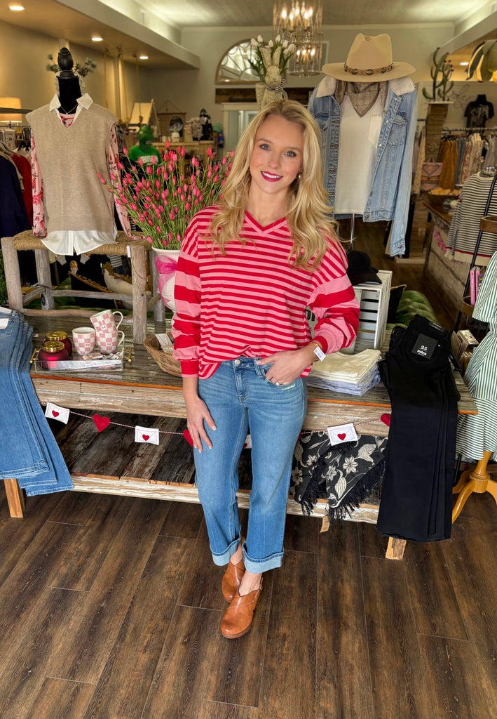 Strawberry Pink Mix Striped Drop Shoulder Patchwork Sleeve V Neck Pullover