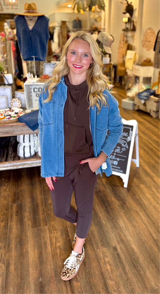 Vintage washed French terry button up. Relaxed fit in the color denim blue.