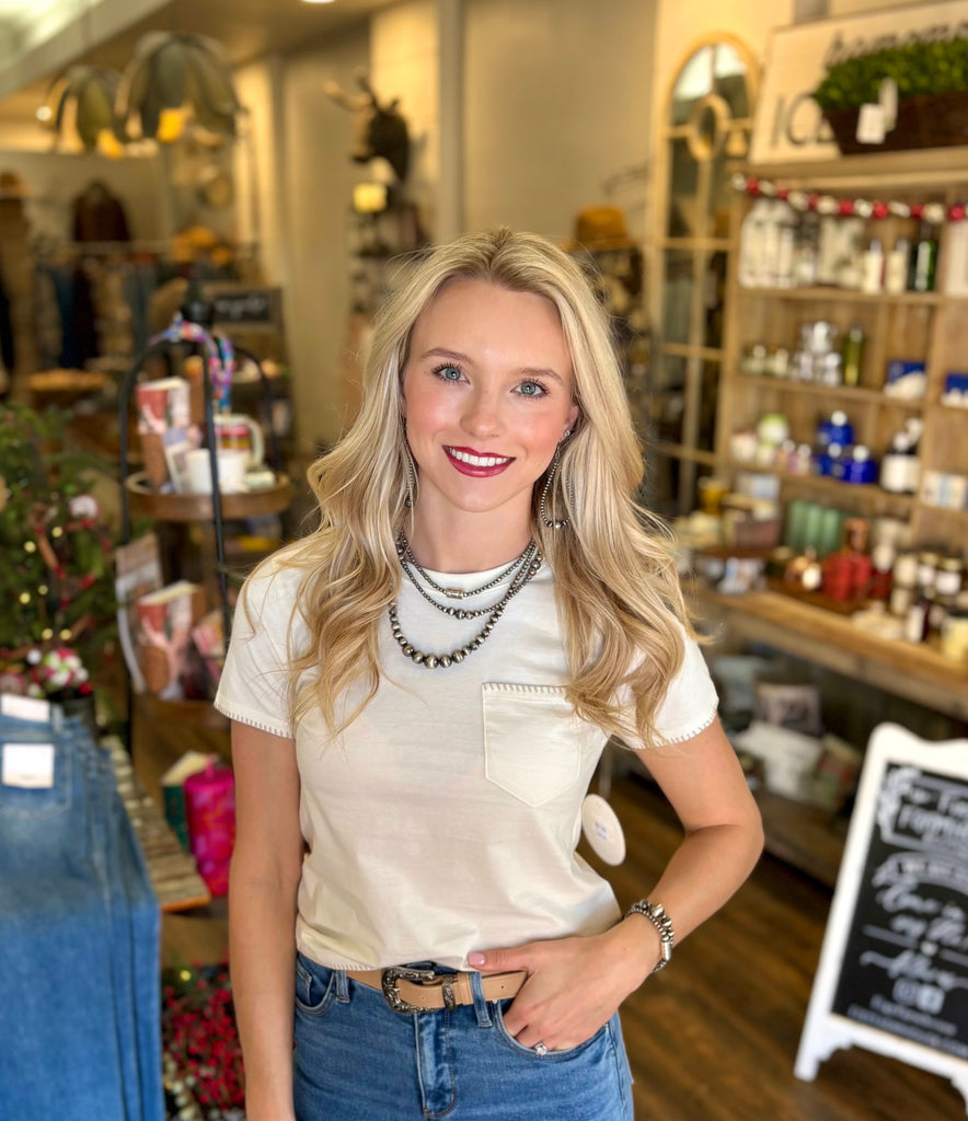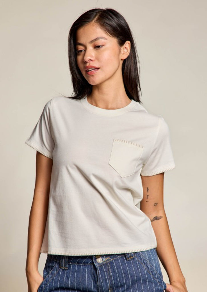 An everyday essential with thoughtful detail. The Whipstitch Pocket Tee features contrast whipstitch edging along the sleeves, hem, and chest pocket for a subtle handcrafted look that sets it apart from a basic tee. Made from soft, breathable cotton with a relaxed yet flattering fit, this top is easy to dress up or down for any season.