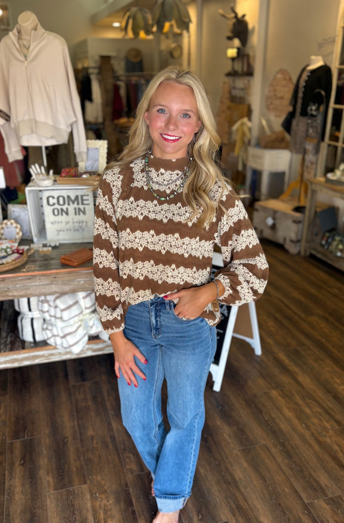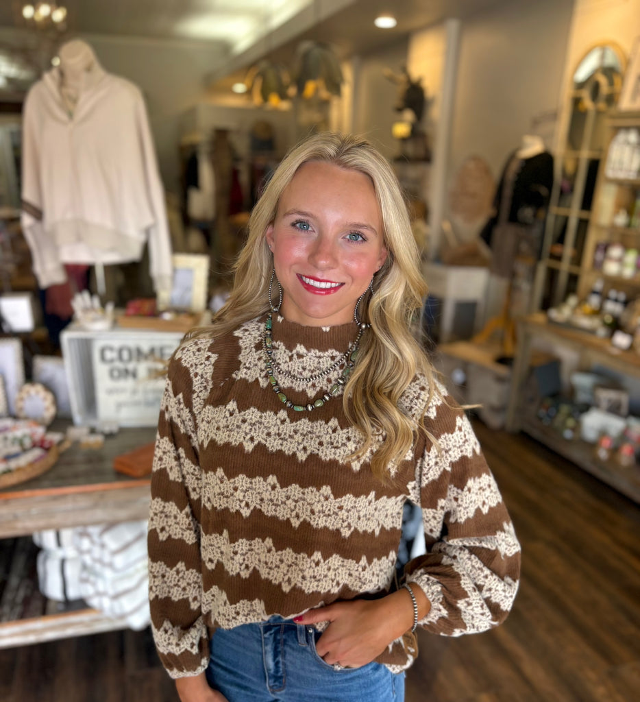 Brushed floral jacquard mock neck sweater top in the color mocha. Loose fit.