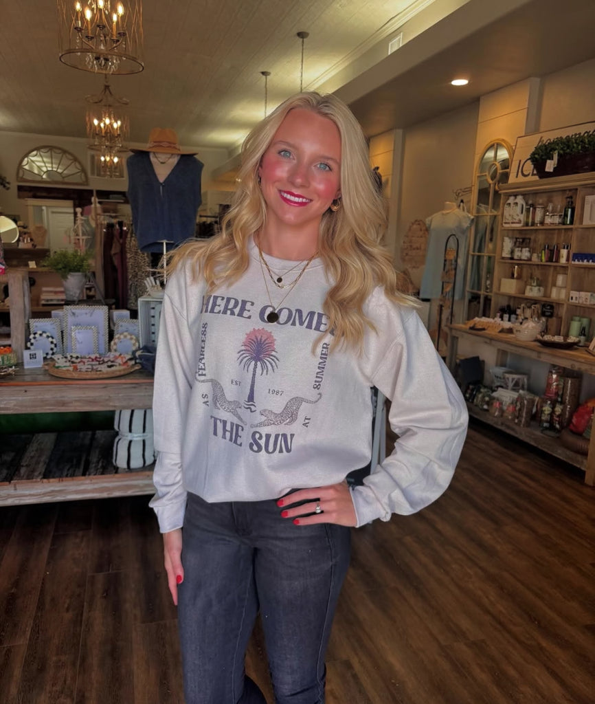 Cotton here comes the sun graphic sweatshirt in the color sand.