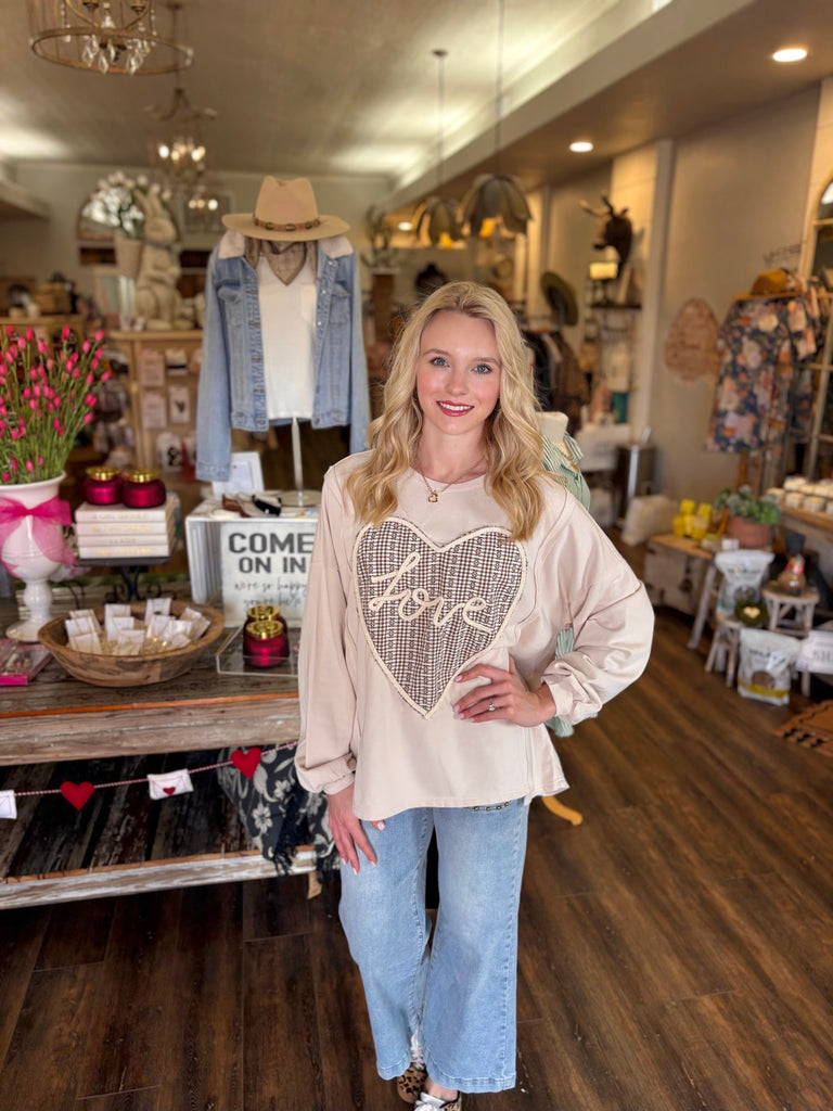 Description: HEART PATCH FRONT WASHED TERRY KNIT PULLOVER