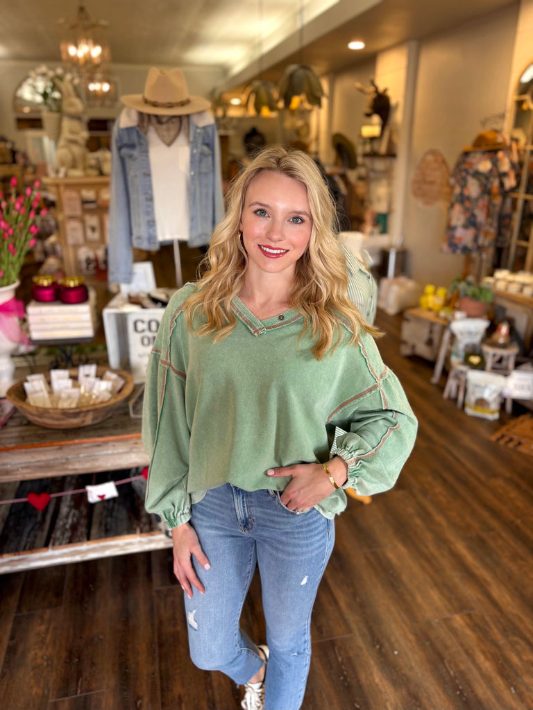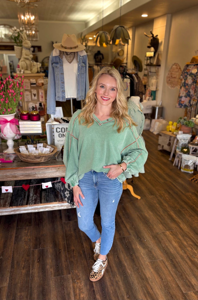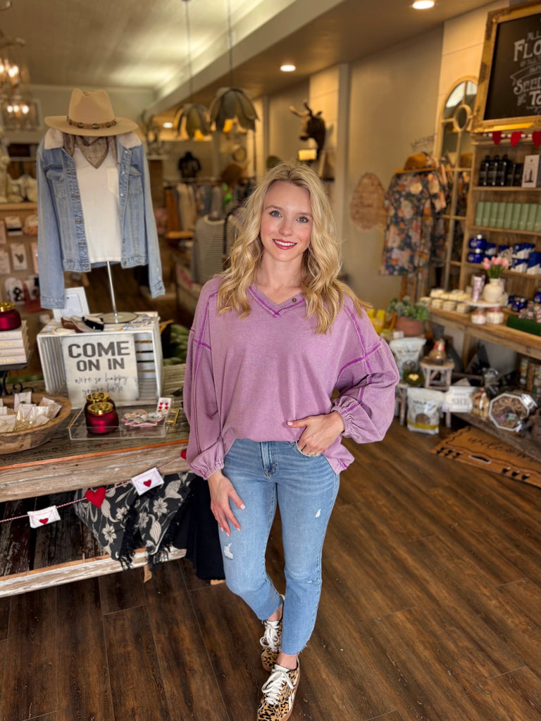 This washed V-neck top is the definition of effortless everyday style. Designed with a relaxed fit and soft lived-in feel, it features exposed seam detailing, a flattering neckline, and lightly gathered balloon sleeves for a feminine touch. Easy to dress up or down, this top pairs perfectly with denim, sneakers, or booties for a casual yet polished look.