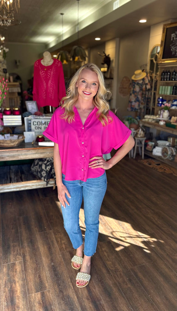 Turn heads in this vibrant statement top that’s as flattering as it is effortless. This silky satin blouse features a bold hot pink hue that instantly brightens your look, while the relaxed silhouette keeps it easy and comfortable for all-day wear. Designed with a classic button-front closure, soft collar neckline, and flowy short sleeves, it drapes beautifully without clinging.