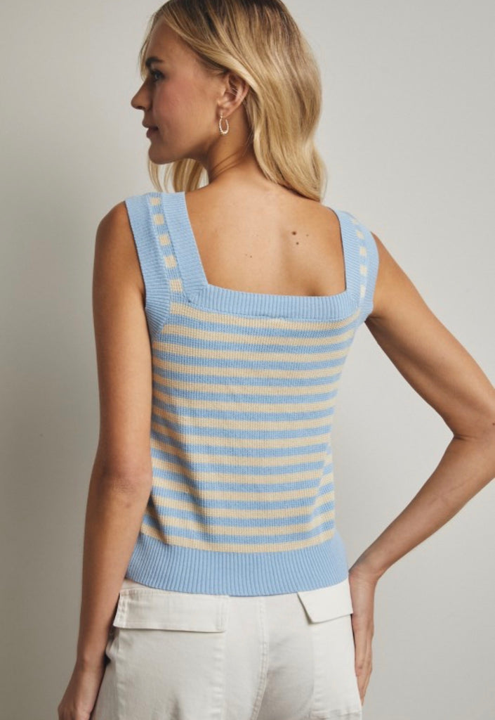This striped sweater tank is the perfect mix of classic and fresh. Designed with a flattering square neckline and a soft, lightweight knit, it features timeless stripes in a beautiful powder blue and ecru colorway. Easy to wear on its own or layered under a jacket, this sleeveless sweater tank is perfect for transitioning seasons and everyday styling.