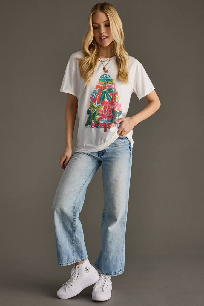 White graphic tee Bow Christmas tree graphic on the front 60% Polyester/35% Rayon/5% Spandex