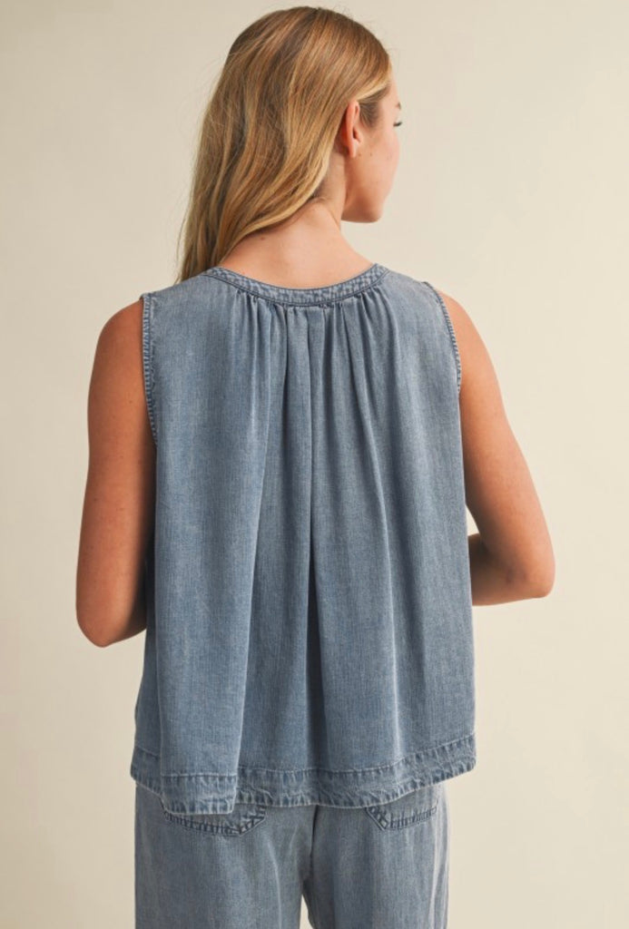 Effortless, lightweight, and perfect for everyday wear! This chambray sleeveless top features a soft, flowy silhouette with a classic button-front detail and subtle gathered neckline for a flattering drape. The breathable lyocell fabric gives it that denim look while keeping it ultra lightweight and comfortable for warmer days.
