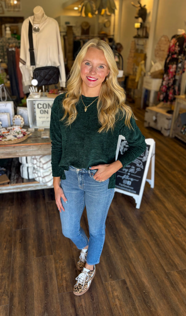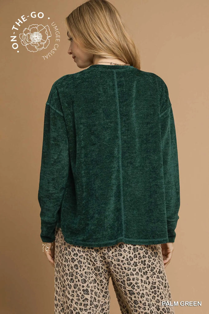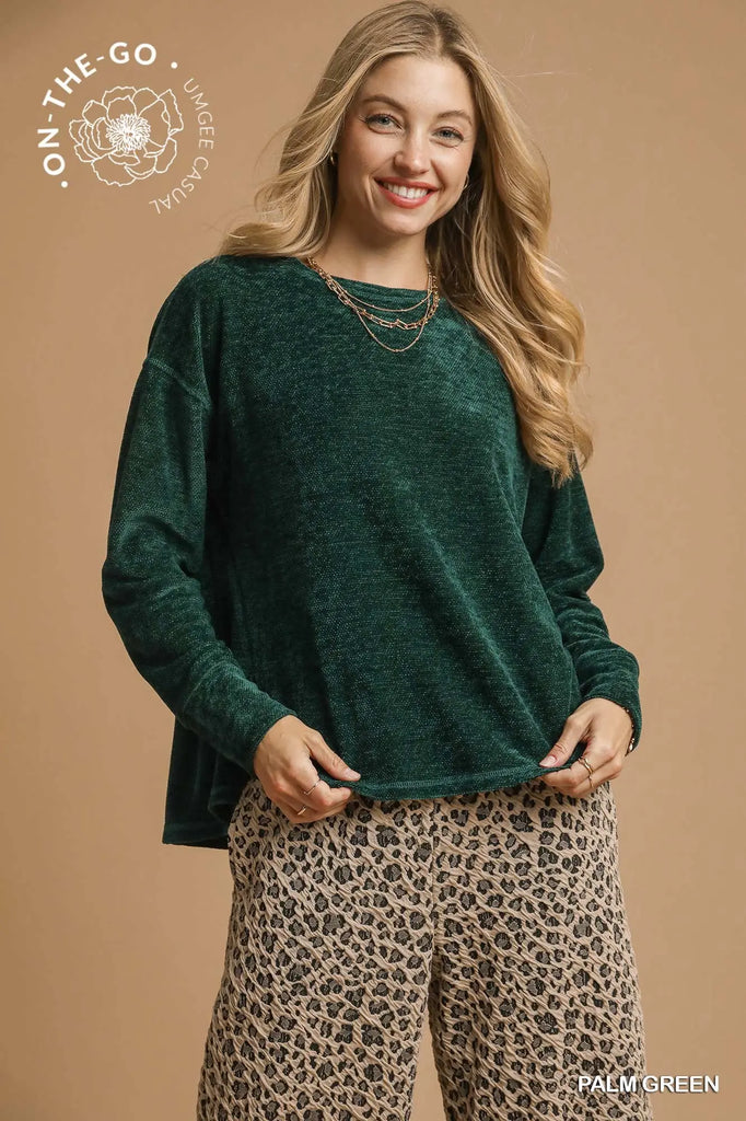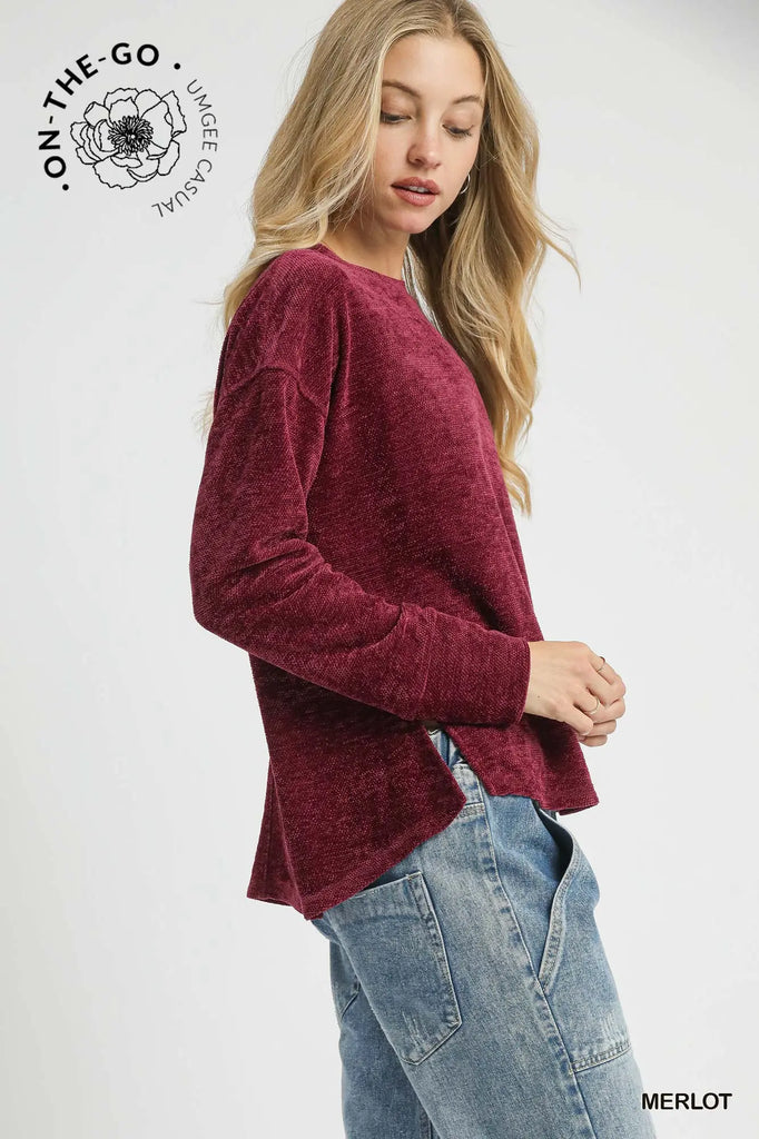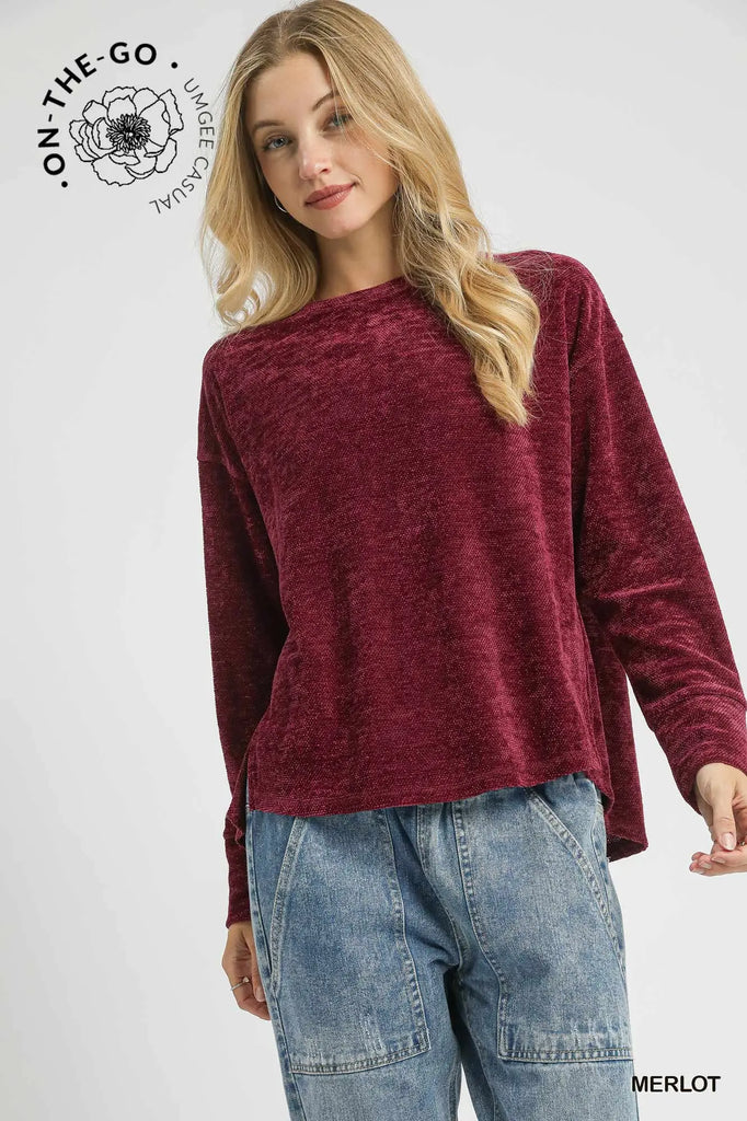 Key Features• Soft textured knit• Crew neck• Oversized dolman sleeves • High-low with side slits• Not Lined