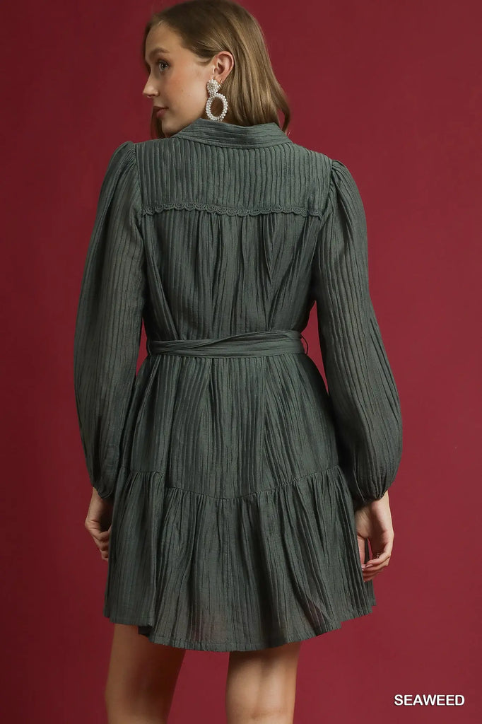 Key Features• Crinkle-textured material• Classic collared neckline• Button down • Trim & belt detail • Lined