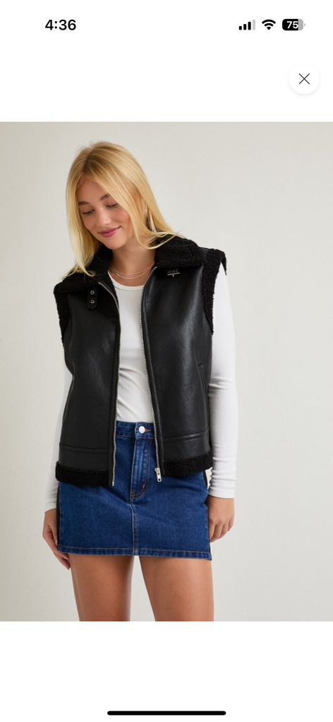 This black faux leather shearling vest is a must-have layering piece for cooler seasons. Featuring a soft sherpa-style lining and collar, it adds warmth and texture while keeping a sleek, modern look. The zip-front design and relaxed fit make it easy to style over long sleeves, knits, or lightweight sweaters for everyday wear.