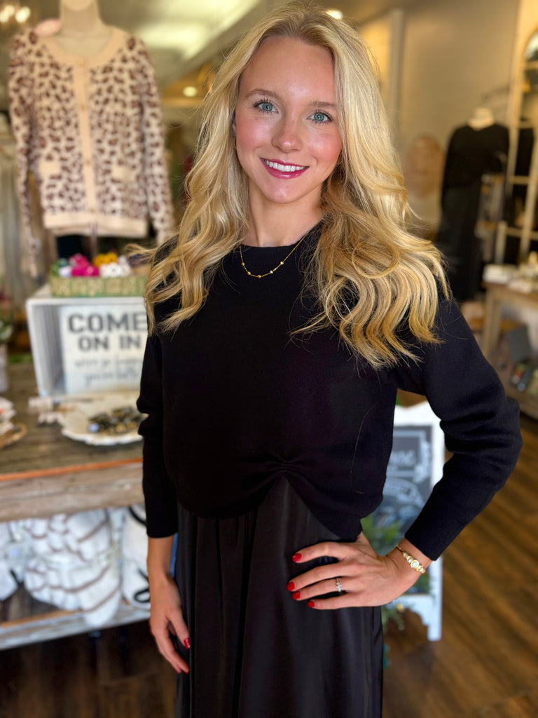 Front pleat midi dress with sweater on top. Dress and sweater are not attached.