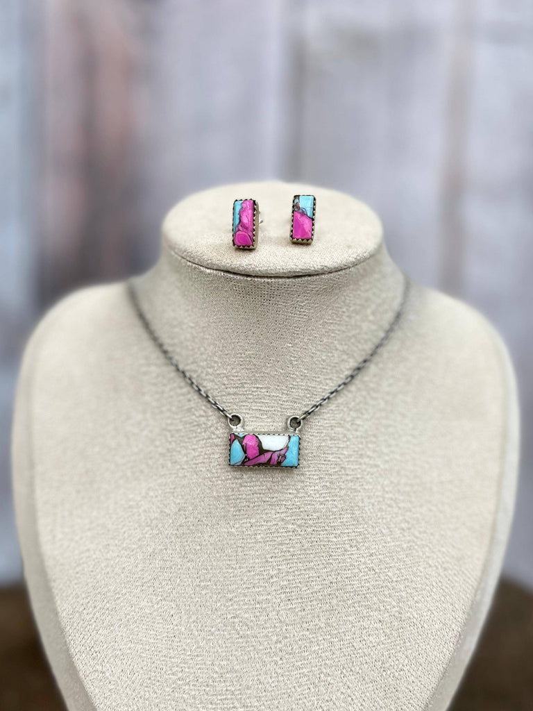 Product Details: * Category: Necklace and Earrings Set * Main Stone: Cotton Candy Turquoise * Metal Purity: 925 Sterling Silver * Brand: Nizhoni Traders LLC * Each listing is for 1 set only Beautiful Handmade Sterling Silver Cotton Candy Turquoise Necklace and Earrings Set. Necklace - LENGTH-17+2" Extension, WIDTH- 7/8" Earrings - LENGTH- 3/8 Inches, WIDTH- 3/8" Stamped with “Sterling” and signed by Nizhoni. This piece is Non-Native.