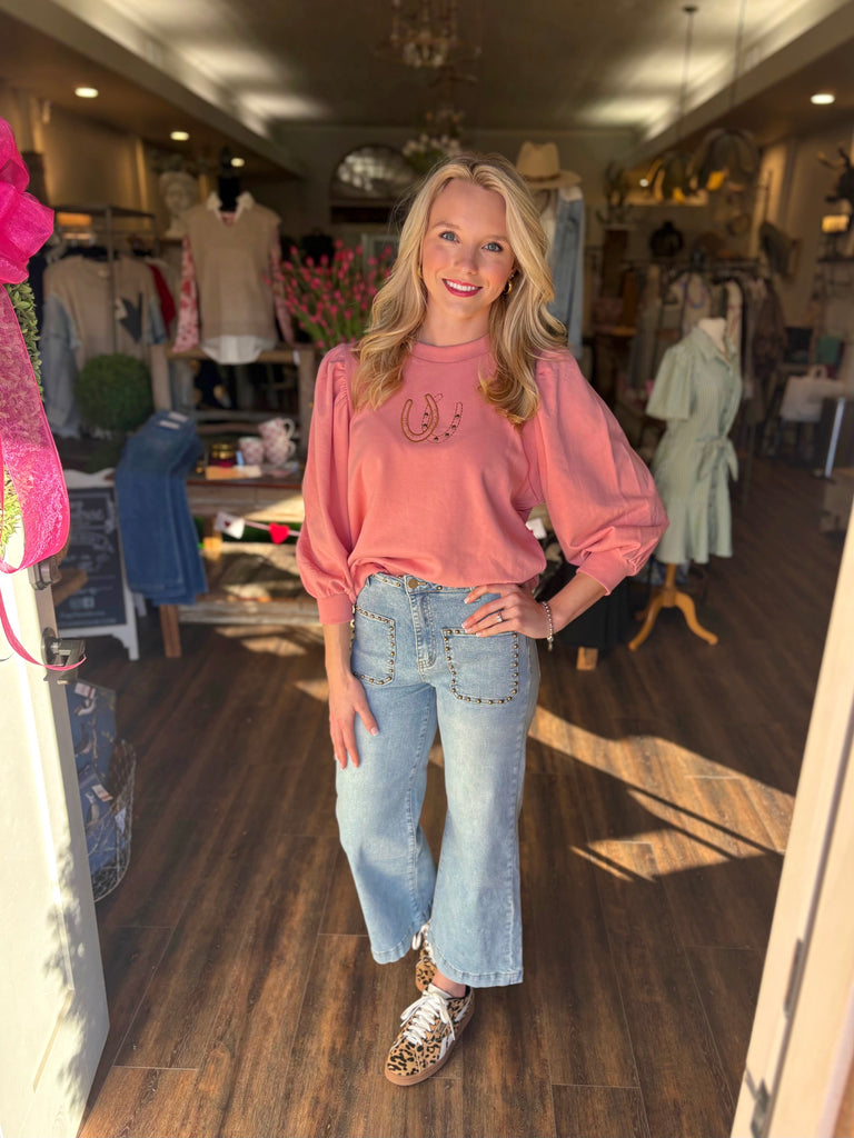 Description: HORSESHOES EMBROIDERY TERRY KNIT TOP