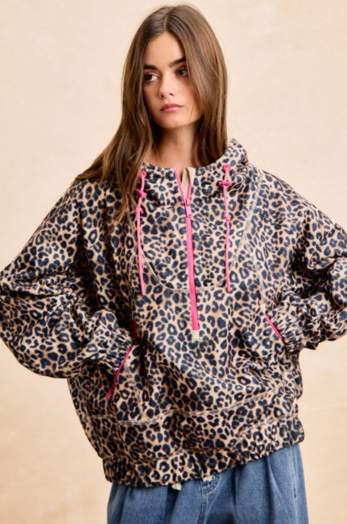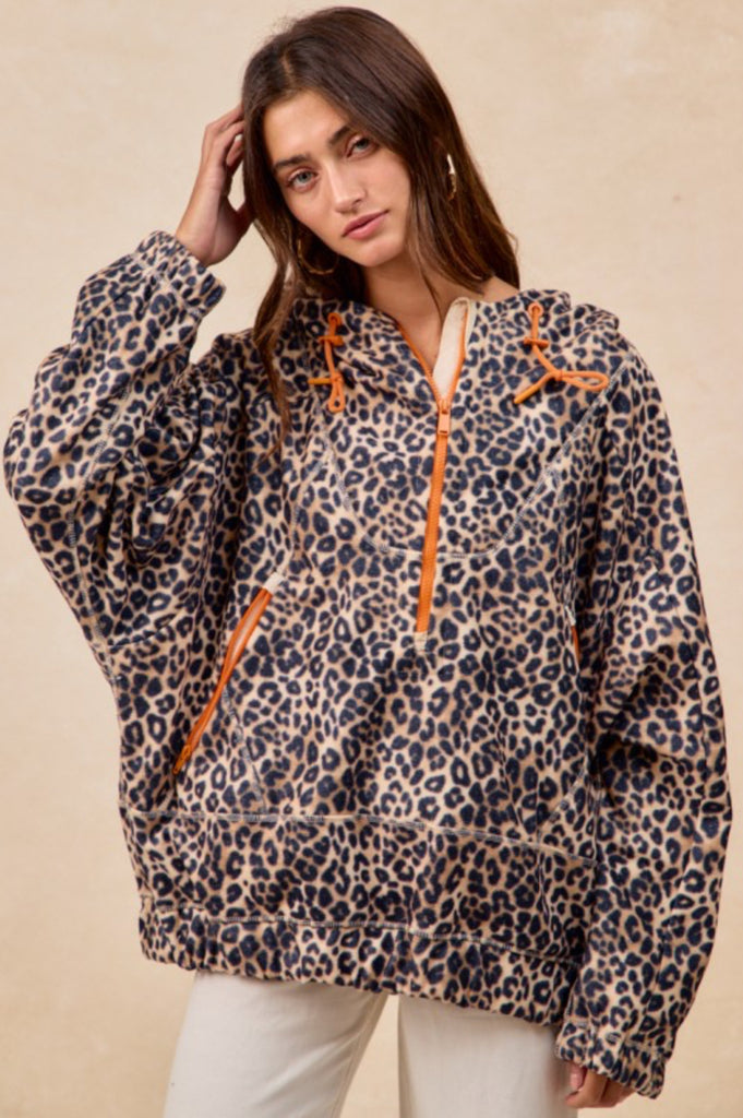 Cozy meets bold in this leopard print oversized hoodie jacket. Designed with a brushed, ultra-soft texture and relaxed fit, this statement layer is as comfortable as it is stylish. Featuring contrast zipper and drawstring details, it adds a fun pop of color while keeping the look casual and effortless. Perfect for throwing on over everyday outfits when you want comfort with a little edge.