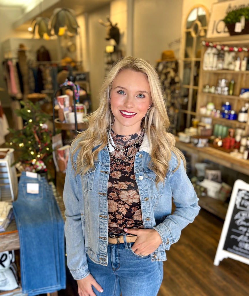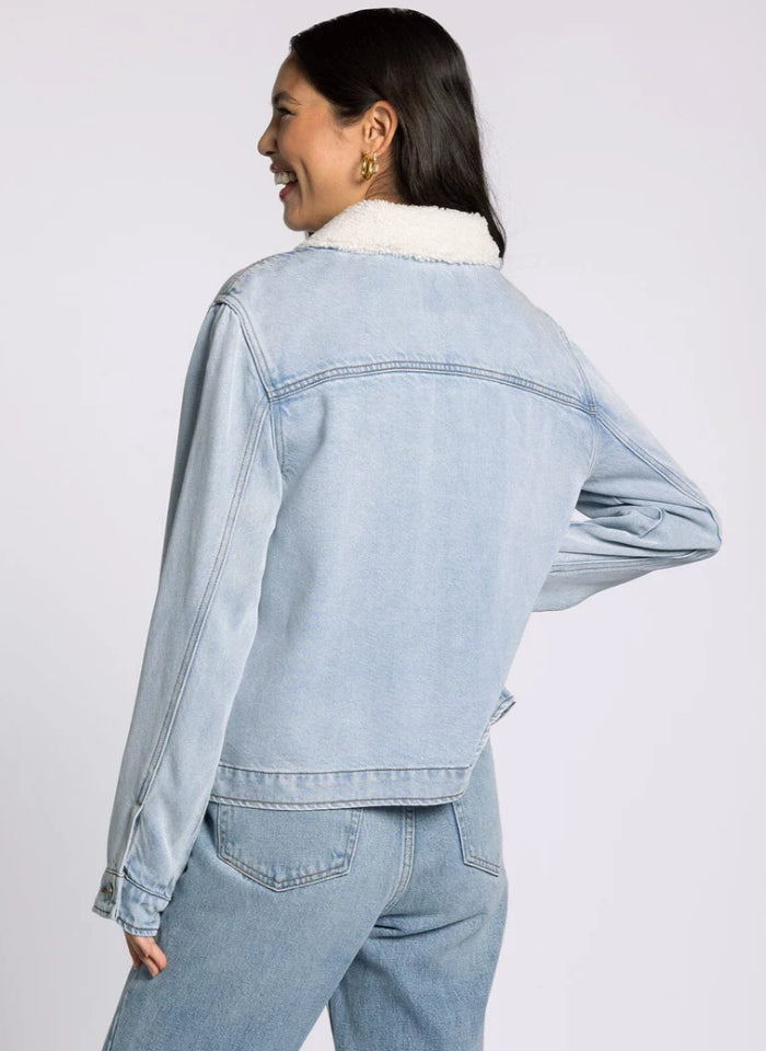 A timeless layering essential with a cozy twist. This classic light-wash denim jacket features a soft sherpa collar for added warmth and texture, giving it that effortless cool-weather appeal. Designed with a structured yet relaxed fit, it includes a full button-front closure, chest flap pockets, and side pockets for everyday functionality. Easy to throw on over tees, knits, or dresses, this jacket is a must-have staple you’ll reach for season after season.