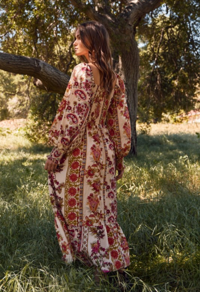 Bohemian style maxi dress with smocking up top and puffed sleeves.